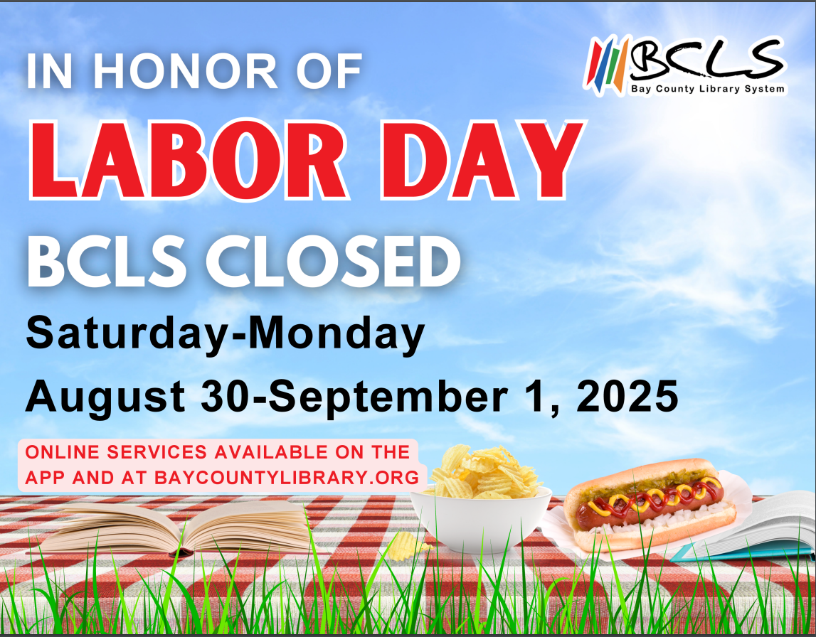 Primary tabs Upcoming List Month Week Day Description The Bay County Library System will be closed Aug 30 - Sep 1, 2025 in honor of Labor Day.