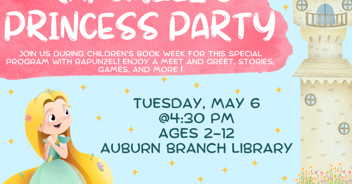 At the Auburn Branch, you are invited to join us for Rapunzel's Princess Party! Enjoy stories, games, prizes, and a meet and greet with Rapunzel!