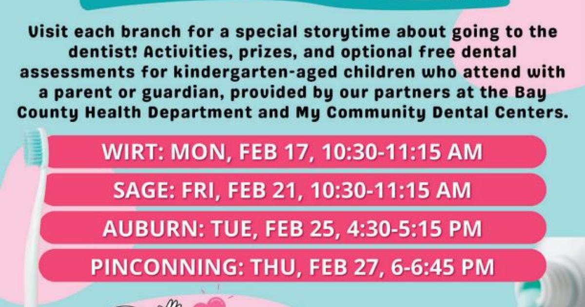 February is National Children's Dental Health Month! Visit your branch this month for a storytime all about going to the dentist. Activities, prizes, and optional free dental assessments for kindergarten-aged children who attend with a parent or guardian, provided by our partners at the Bay County Health Department and My Community Dental Centers. A parent or guardian must be in attendance for the dental assessments. My Community Dental Centers is contracted by Bay County Health Department to provide assessments at no charge. No medical/dental insurance information is collected.