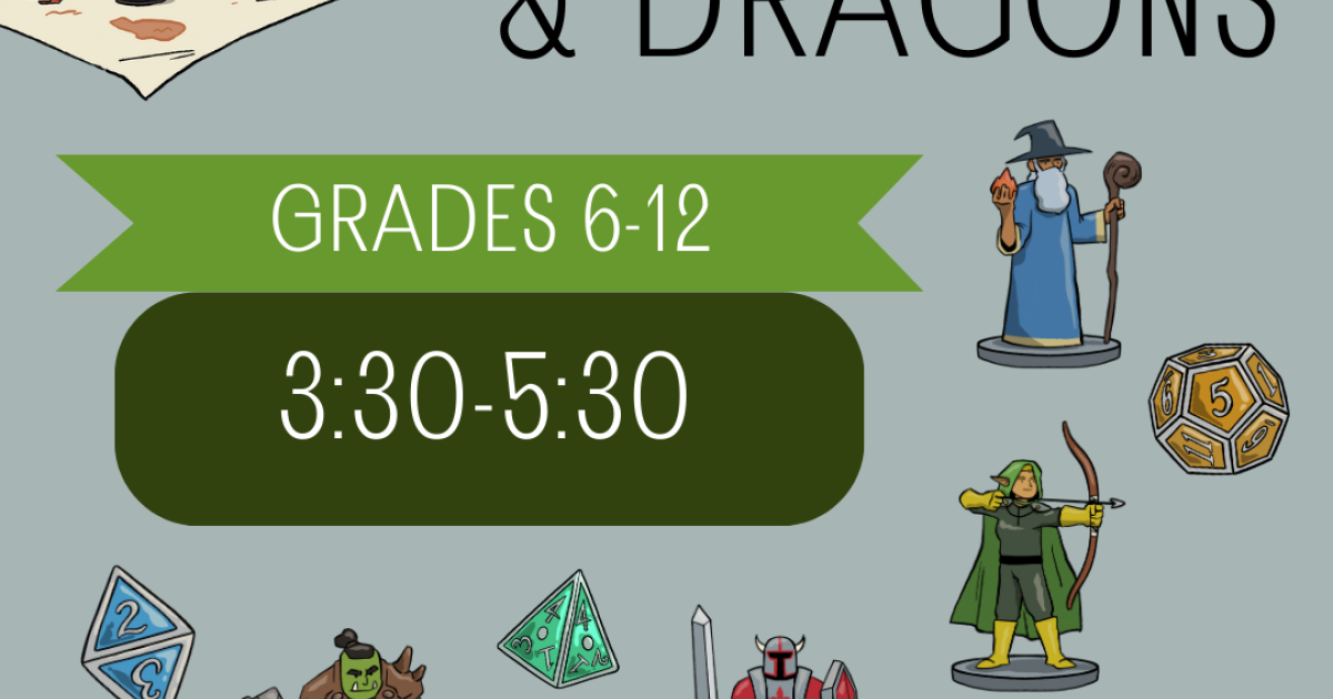 You are welcome to bring your own supplies, but we have lots of dice available. Please bring a level 1 character your first time. If you've never played before or need help making a character, contact Emily at the Sage branch and she will be happy to help you create a character before the session or bring you a pre-made one.
