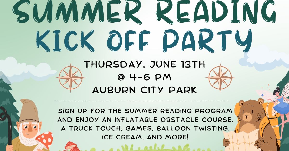 Let's kick off our Summer Reading Program with a party at the Auburn City Park! Sign up for the Summer Reading Program and enjoy an inflatable obstacle course, a truck touch, games, balloon twisting, ice cream, and more.