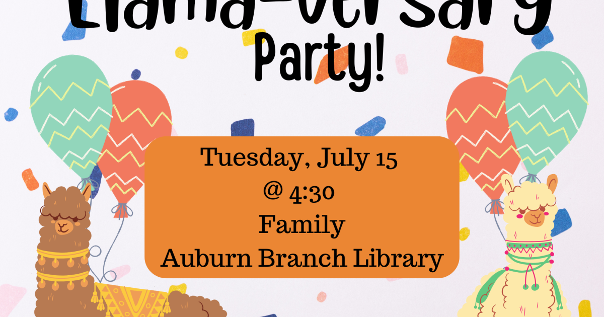 Put on your party hat and get ready to celebrate all things llama! Join us for crafts, games, and cake to celebrate Auburn’s favorite furry mascot, Carl! Guests will also get to meet Carl's cousins, live alpacas, who have traveled from far and wide to celebrate with us!
