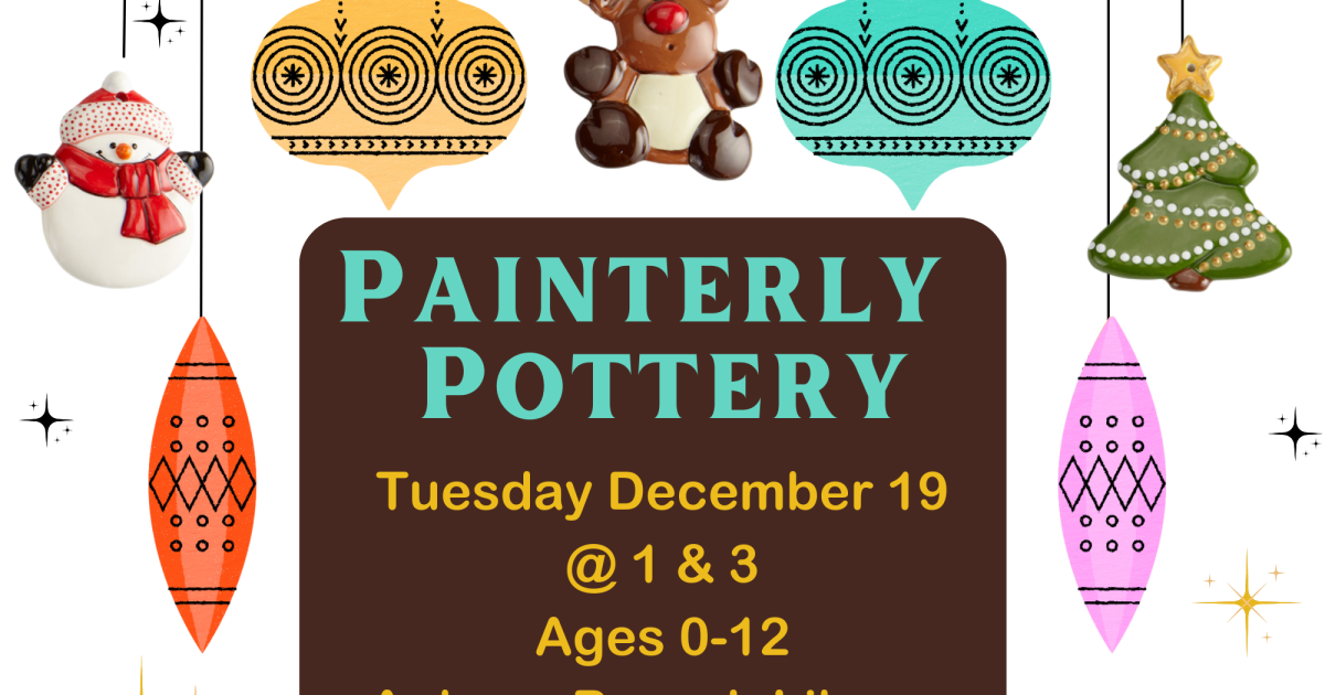 An experienced studio artist from Painterly Pottery will lead the program and bring a wide variety of glazes to decorate ceramic ornaments. Pottery will go back to the studio for firing and can be picked up at Auburn library when ready. Children ages 0-12 are invited to attend.