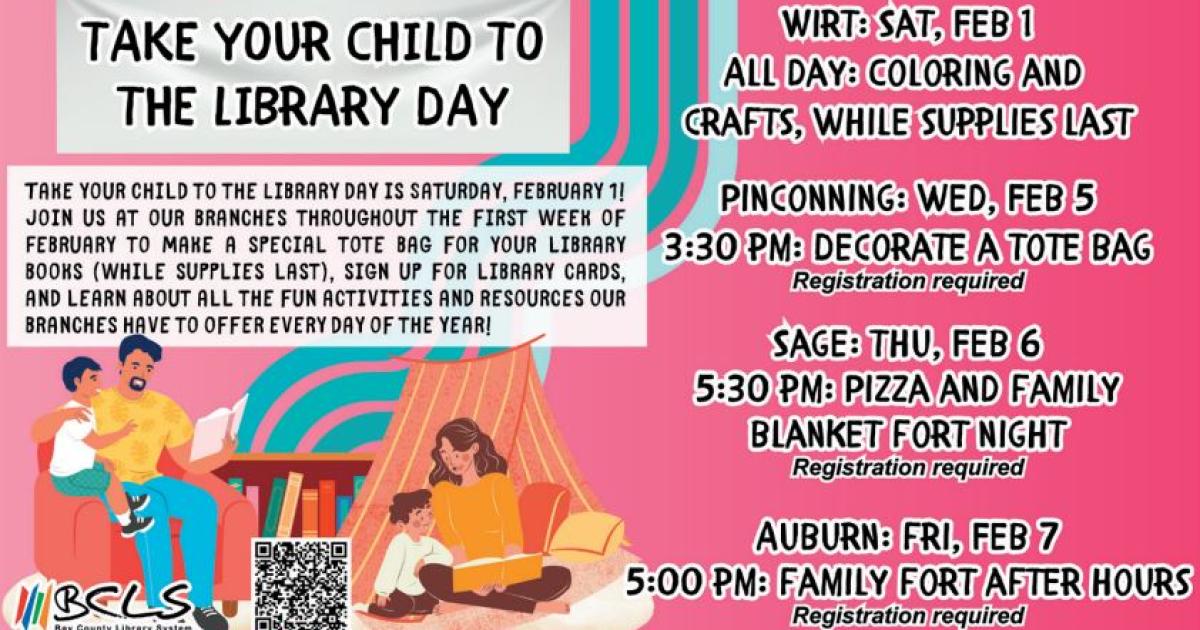 Take Your Child to the Library Day is Saturday, February 1! Drop into our branches throughout the first week of February to make a special tote bag for your library books (while supplies last), sign up for library cards, and learn about all the fun activities and resources our branches have to offer every day of the year!